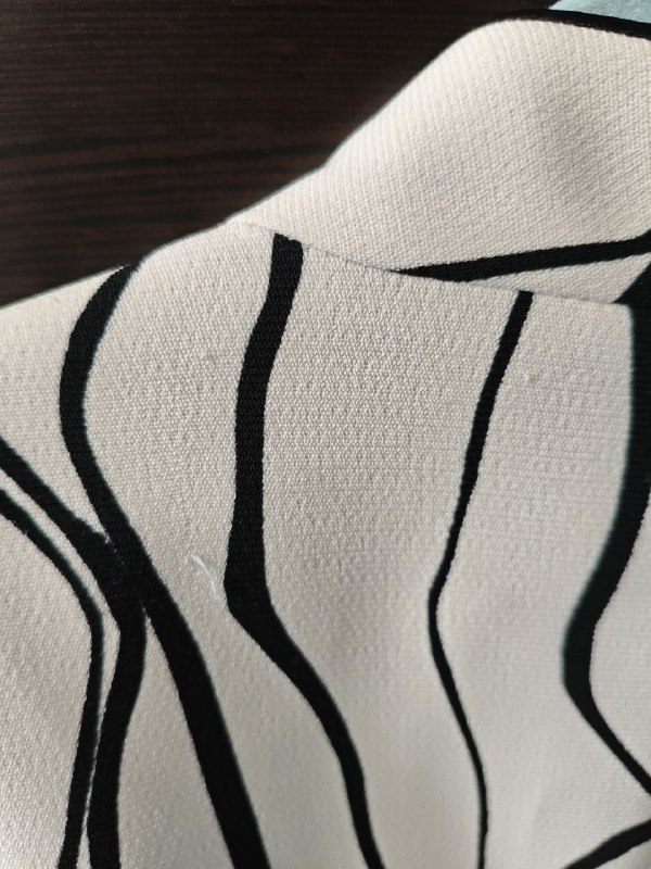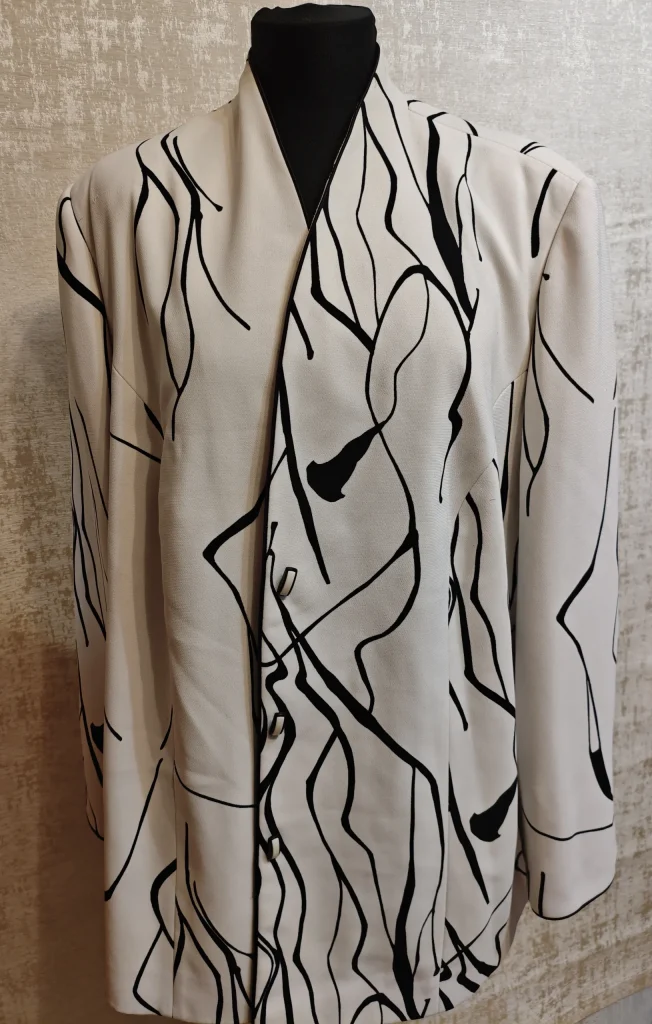 Графичный чёрный рисунок на молочном фоне смотрится дорого и современно. Мягкая линия лацканов, аккуратная застёжка на пуговицы, универсальная длина — отлично подойдёт как к классическим брюкам или юбке, так и к джинсам. Идеальный вариант для офиса, мероприятий или стильных повседневных образов.