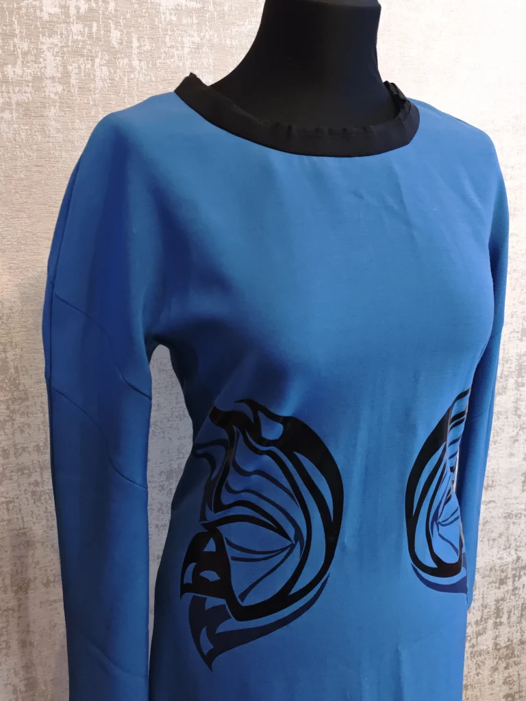 Свободный прямой силуэт дарит комфорт, а контрастный чёрный принт в виде крыльев делает образ выразительным и запоминающимся. Круглый вырез с отделкой и рукав 3/4 добавляют аккуратности. Отличный вариант для повседневных выходов, прогулок или образа «не как у всех».