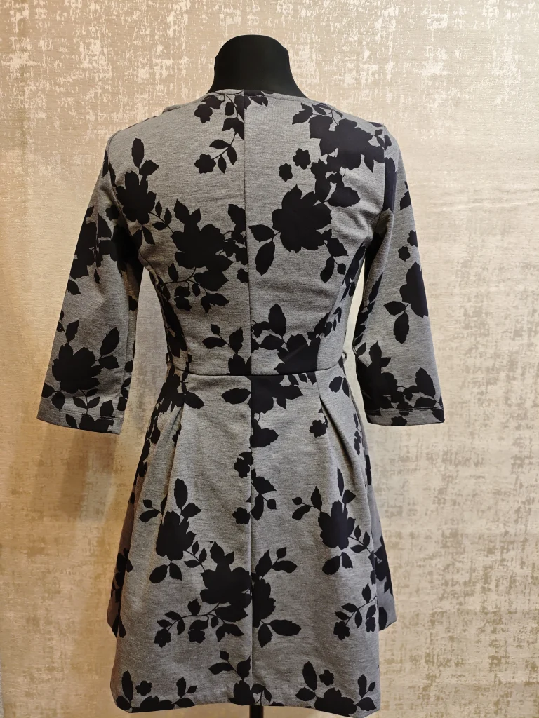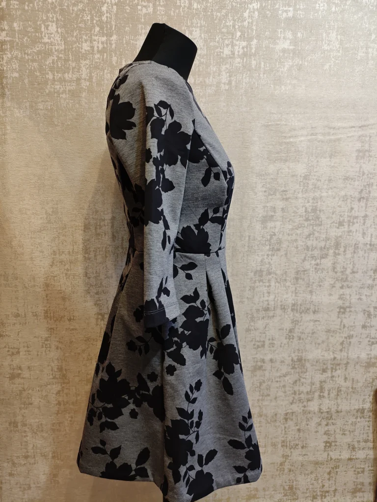 Серо-меланжевая основа с контрастными чёрными цветами смотрится стильно и аккуратно. Приталенный верх подчёркивает фигуру, а слегка расклёшенная юбка добавляет лёгкости образу. Рукав 3/4 — комфортный и универсальный вариант на каждый день. Подойдёт как для офиса, так и для прогулок или встреч.