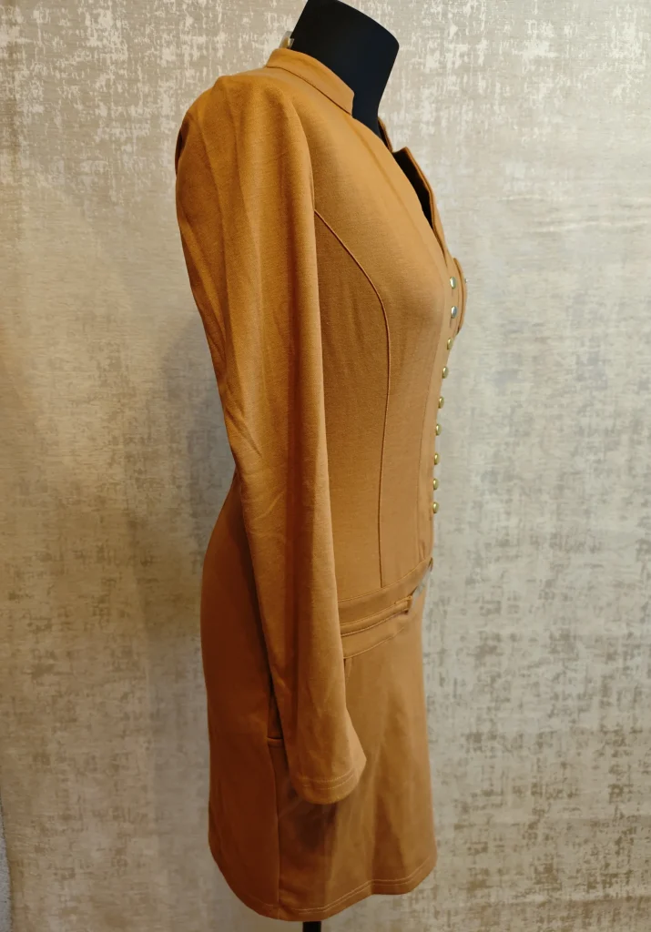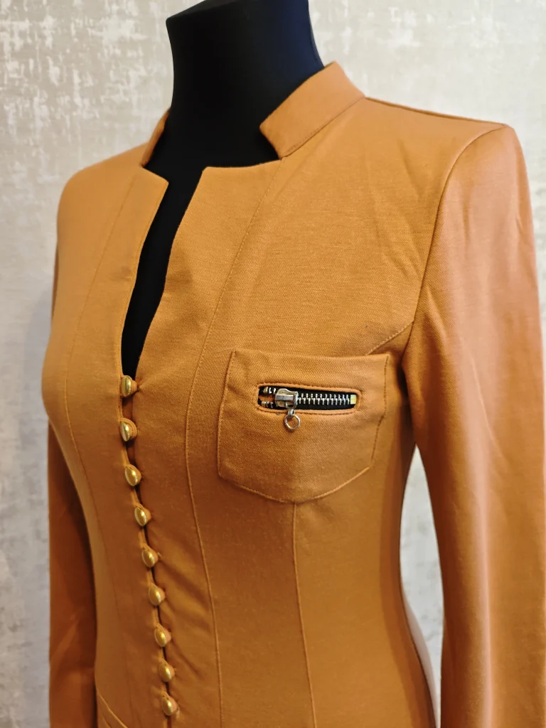 Глубокий V-вырез, ряд декоративных пуговиц по центру, кармашек с молнией и удобные боковые карманы — смотрится “дорого” и подчёркивает фигуру. Отлично подойдёт и на выход, и на каждый день с ботинками/кедами.