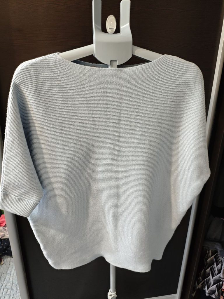 Свободный крой “летучая мышь”/оверсайз — отлично садится, скрывает нюансы и выглядит очень уютно. Классно смотрится с джинсами, брюками и юбкой, можно носить навыпуск или слегка заправить спереди. Размер ориентировачно 44-48 (уточним по замеру)