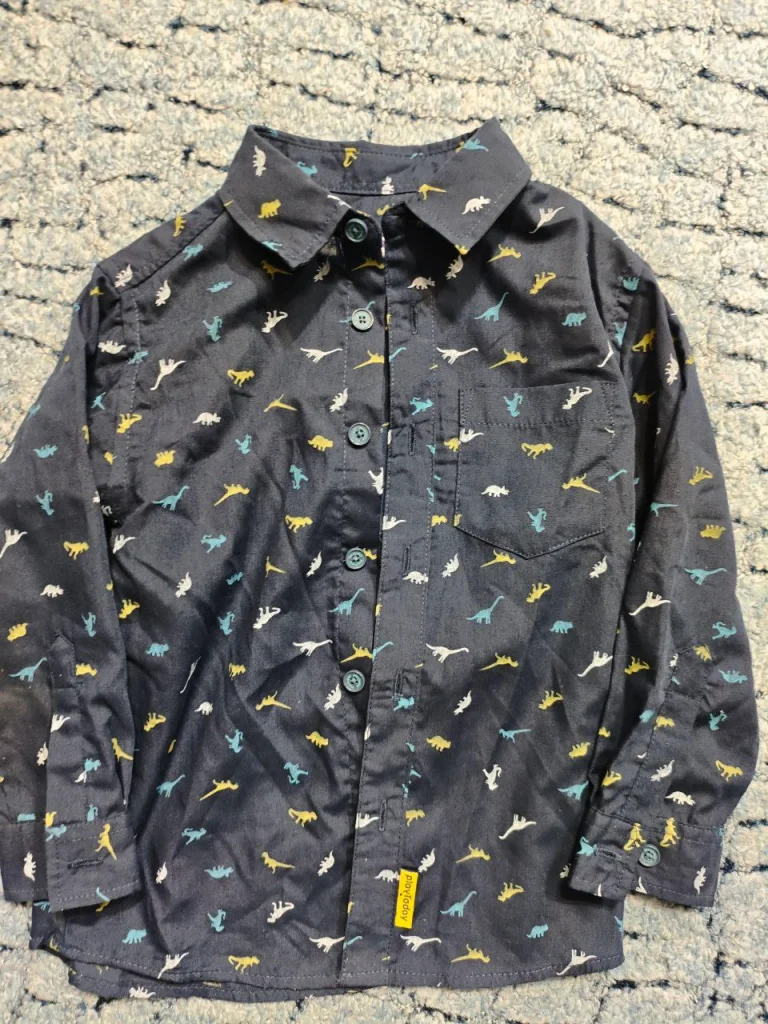 Классная находка для маленького любителя динозавров 🦖 Тёмно-синяя рубашка с милым принтом — подойдёт и в садик, и на прогулки.