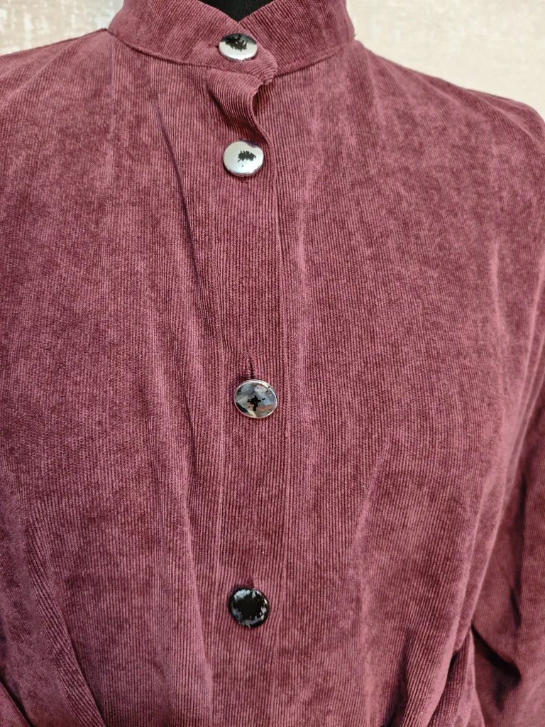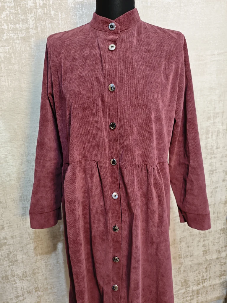 Мягкий вельвет выглядит дорого и приятно ощущается на коже, а вертикальная застёжка на пуговицы визуально вытягивает силуэт.